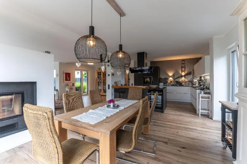Ansicht vom GartenWohnbereich mit Kamin und mehreren Zugängen zum liebevoll angelegten GartenEssbereich mit offener KücheToller GartenTolle DachterrasseWellnessoase im ObergeschossVielfältig nutzbares Zimmer im UntergeschossDuschbad im Untergeschoss