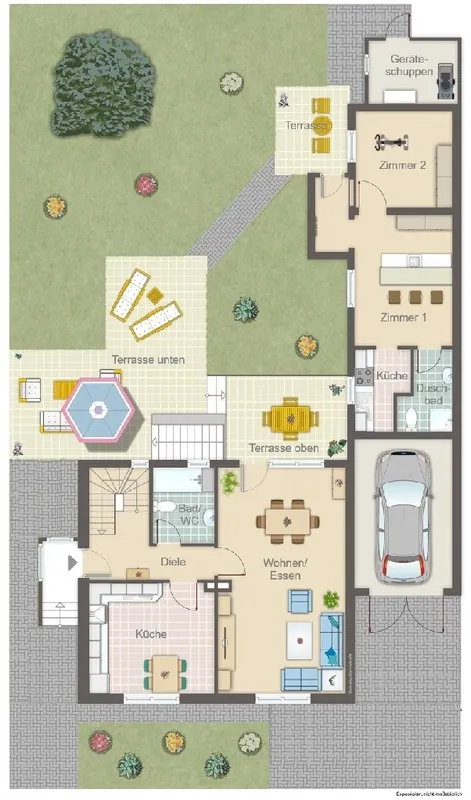 FrontansichtWohnraum Ansicht 1Wohnraum Ansicht 2Wannenbad EGKüche mit SitzgelegenheitDuschbad DGZimmer 1 DGZimmer 2 DGZimmer 3 DGBlick in den GartenRückansichtGrundriss ErdgeschossGrundriss DachgeschossGrundriss Kellergeschoss